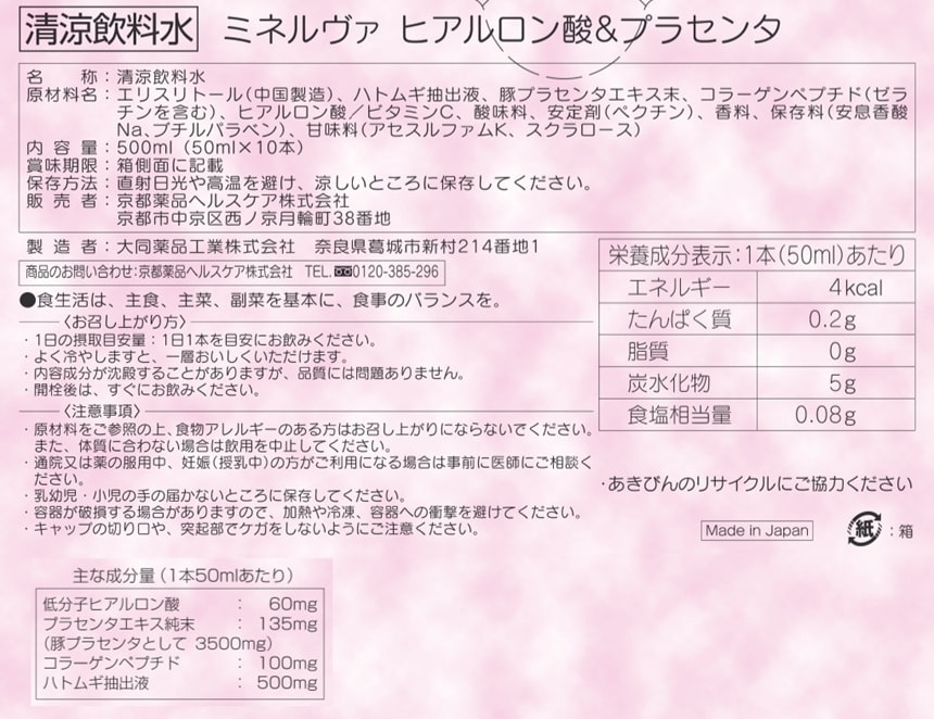 京都で半世紀以上の歴史がある製薬会社の京都薬品工業(株)が長年の研究や経験で導き出した美容ドリンク「ミネルヴァ ヒアルロン酸&プラセンタ」。