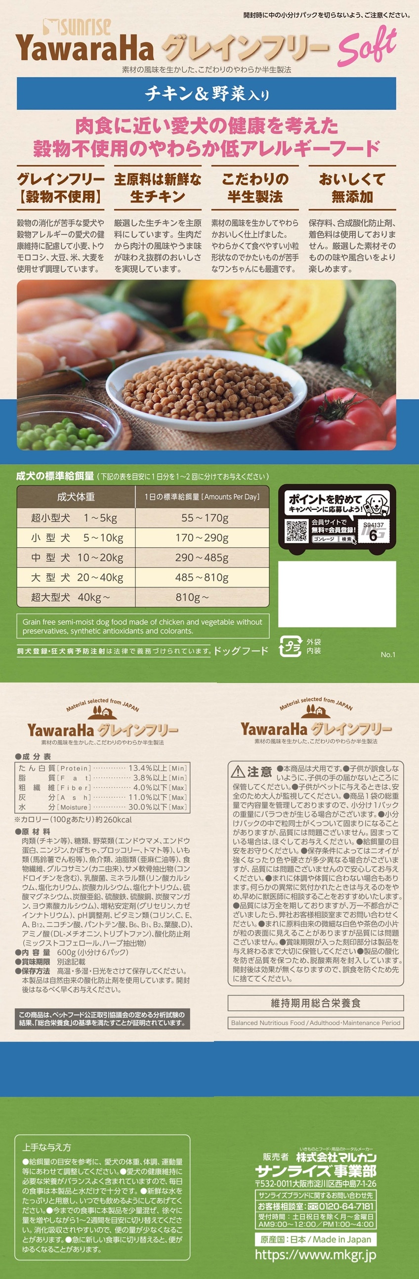 [2個]マルカン・サンライズ事業部 ヤワラハ グレインフリー ソフト チキン&野菜入り 600g | 素材の旨味を生かした半生タイプ総合栄養食!
