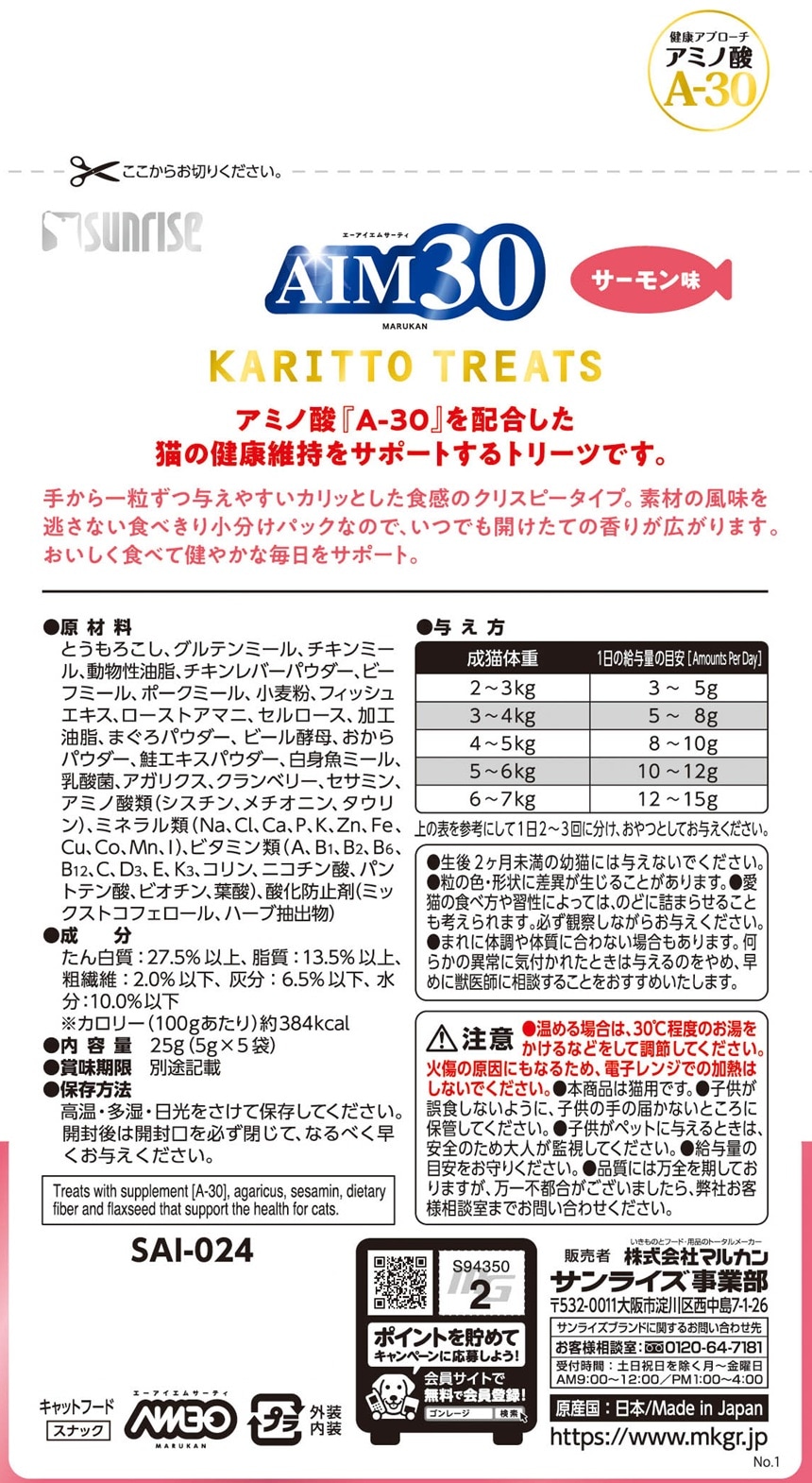 [15個]マルカン サンライズ事業部 AIM30 カリッとトリーツ サーモン味 5g×5袋 | 猫の健康維持をサポート!