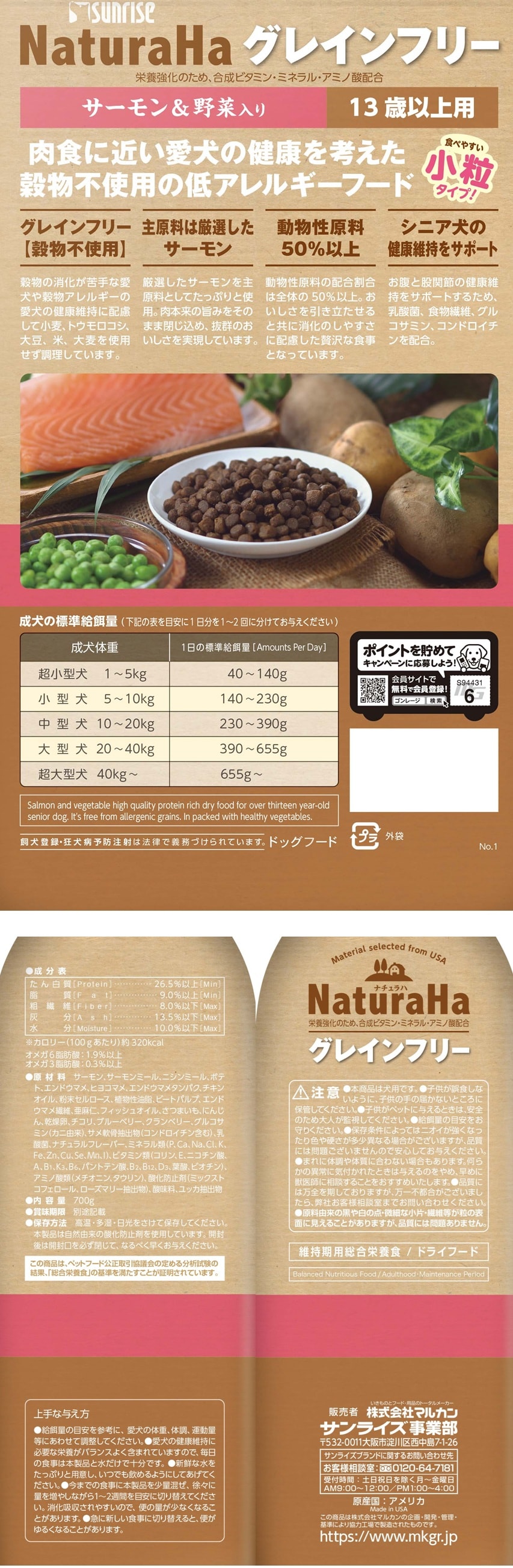 [4個]マルカン・サンライズ事業部 ナチュラハ グレインフリー サーモン&野菜入り 13歳以上用 小粒 700g | グレインフリーで作った犬用ドライフード!