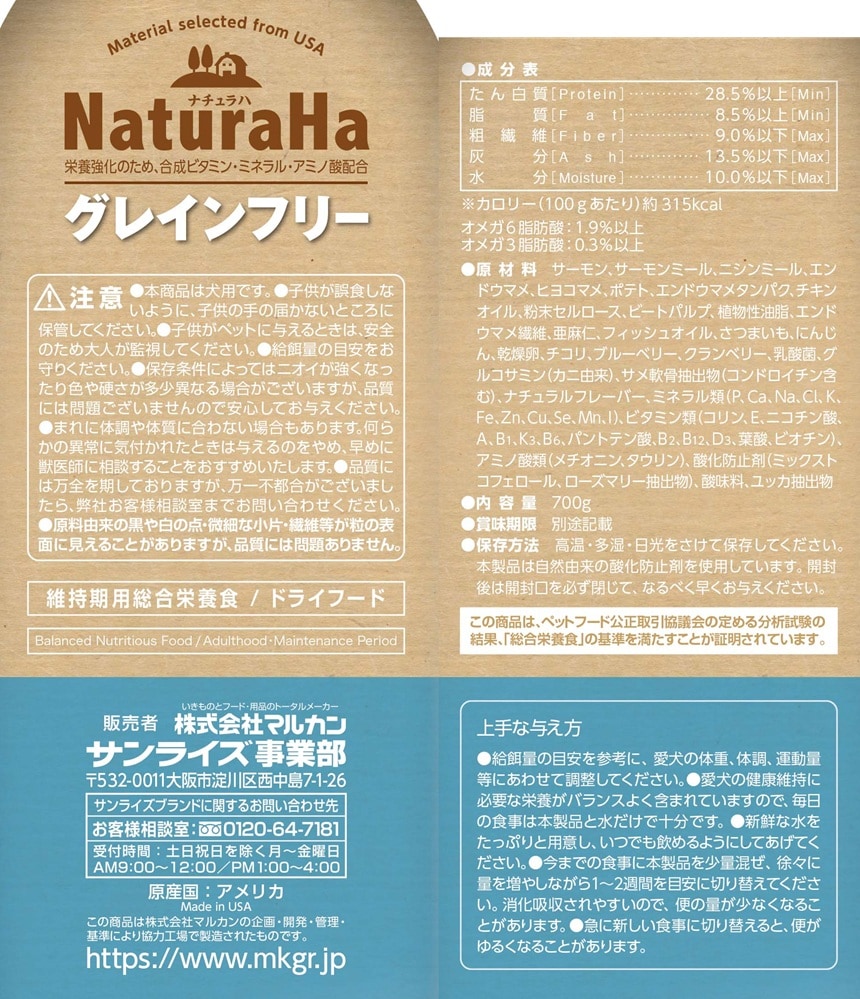 [2個]マルカン サンライズ事業部 ナチュラハ グレインフリー サーモン&野菜入り 体重管理用 小粒 700g | グレインフリーで作った犬用ドライフード!