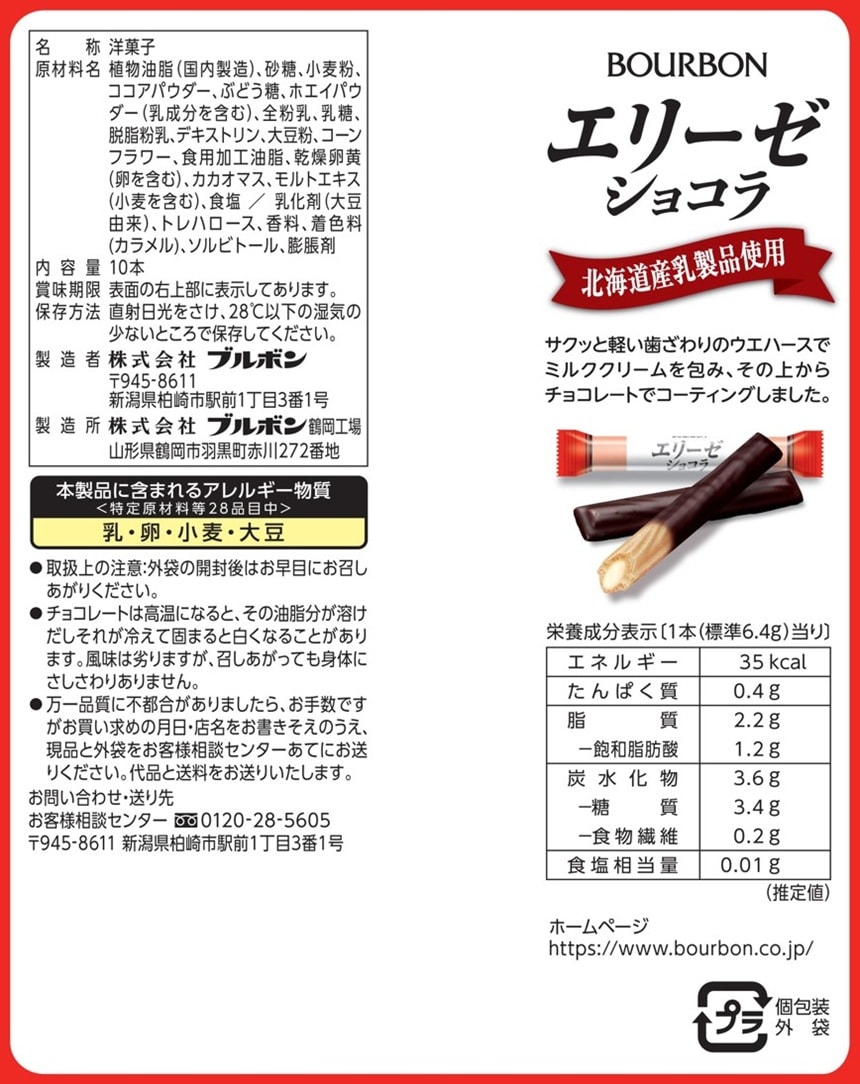 [12袋]ブルボン エリーゼショコラ 10本入 | チョコとミルクの豊かな味わい