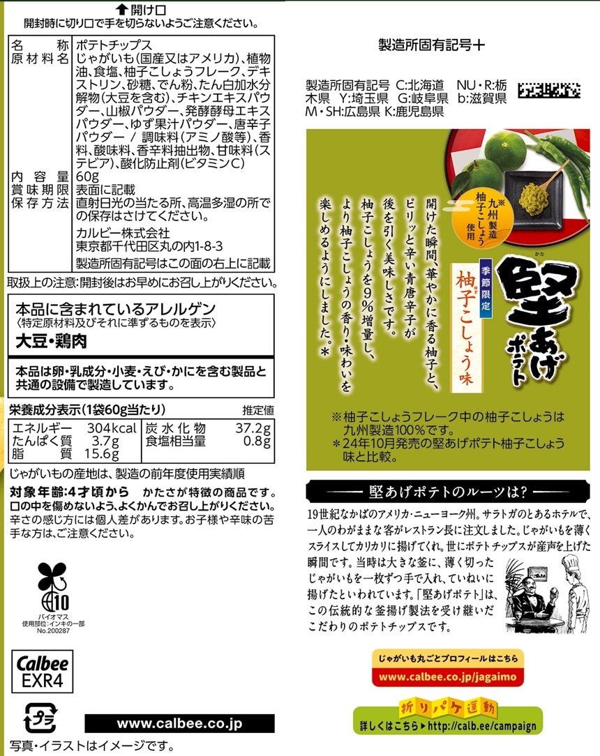 [12個]カルビー 堅あげポテト 柚子こしょう味 60g | 九州製造の柚子こしょうフレーク(※1)を使用した本格的な味わい。