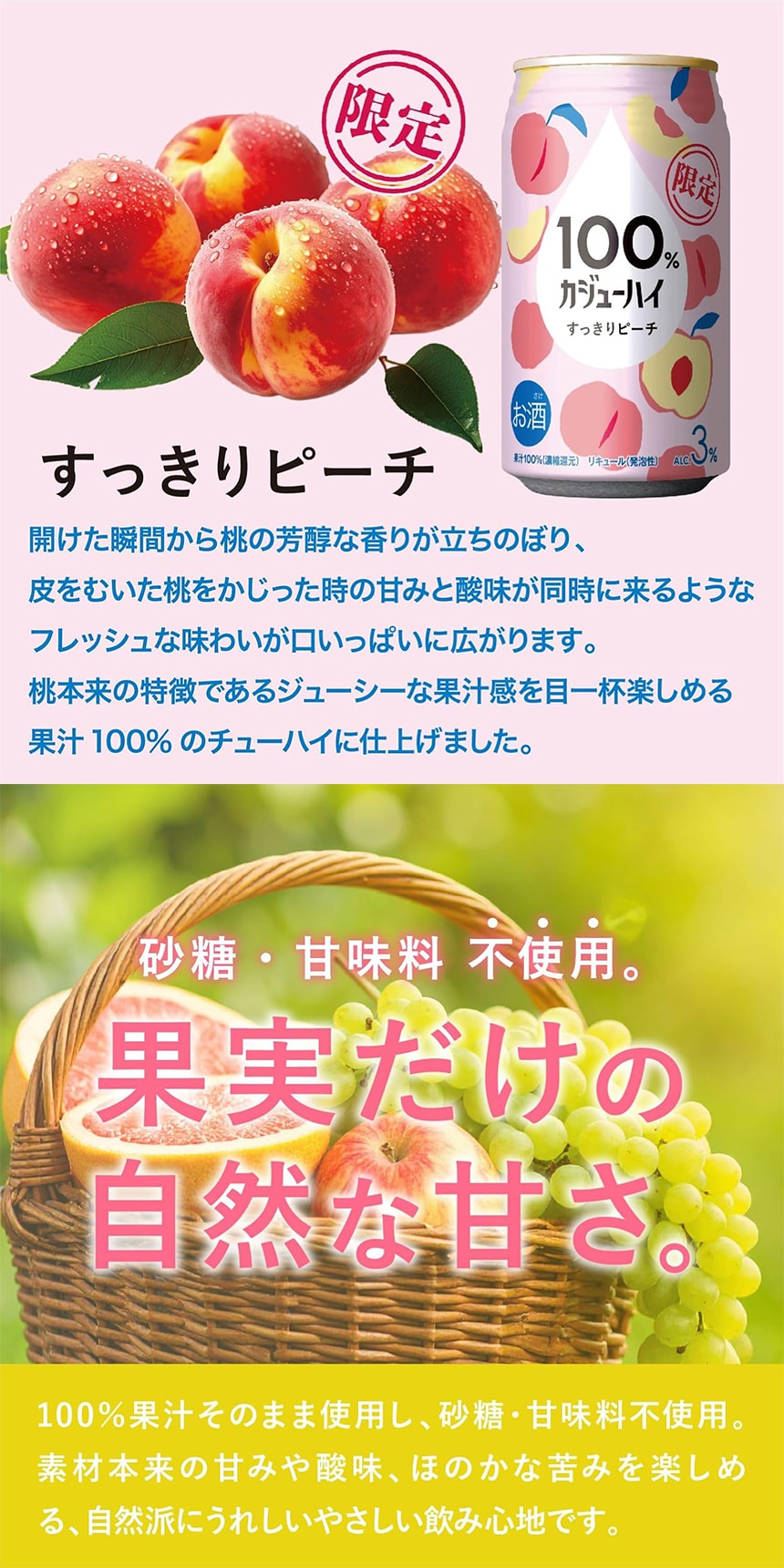 桃本来の特徴であるジューシーな果汁感を目一杯楽しめる果汁100%のチューハイに仕上げました。