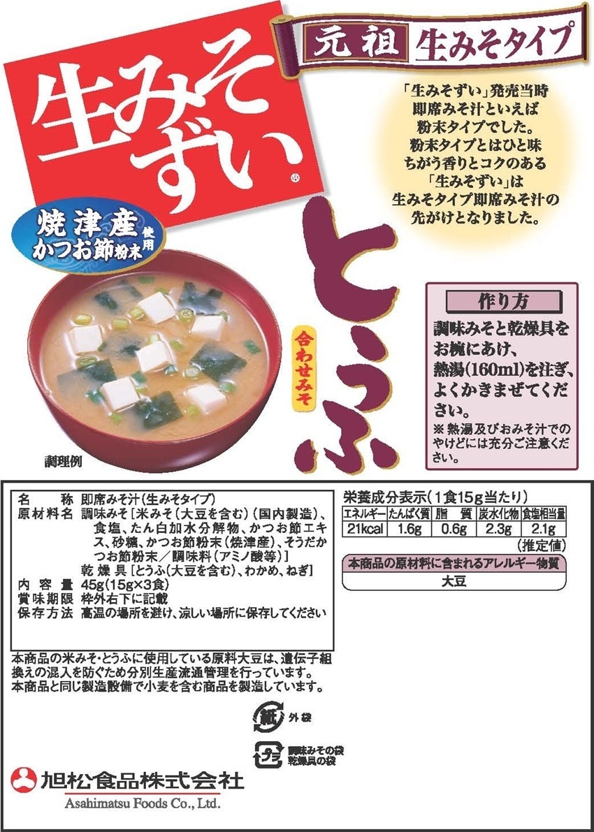 豆腐、わかめ、ねぎが入った生みそタイプの即席みそ汁。焼津産かつお節粉末使用。