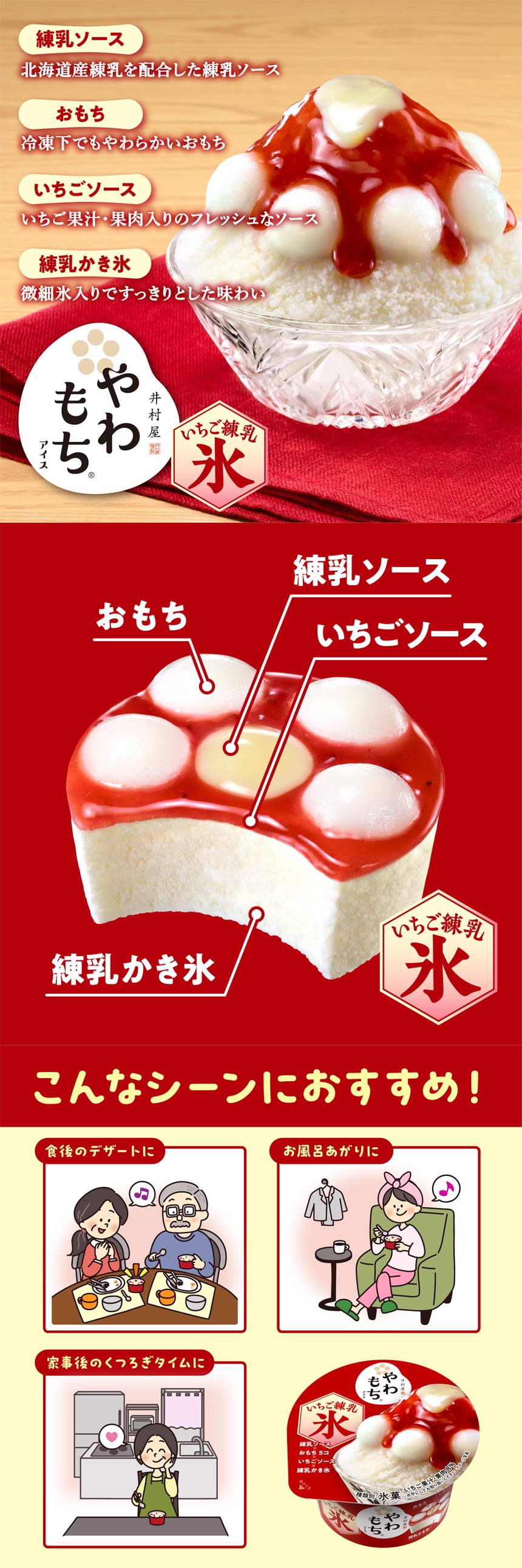 生のいちごから作ったようなフレッシュな味わいのいちごソースとしっかりと甘みを感じられる練乳ソースにおもちを組み合わせることで、甘味処のかき氷を再現しています。