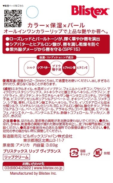 シルク&シアバターを配合しているため、なめらかでしっとりとした唇に導き、さらにヒアルロン酸、ブドウ種子油、ビタミンEが潤いを与えます。