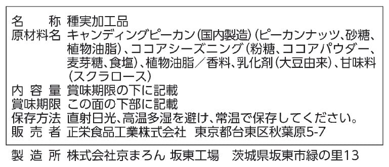 ナッツ本体の甘さや香ばしさを引き立てるちょっとビターなココア味です。甘くサクサクとした軽い食感に仕立てたピーカンナッツです。