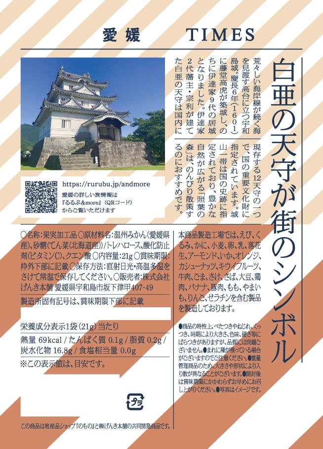 愛媛県温州みかんを使用したセミドライフルーツ。独自の低温蒸散製法により素材の味や香りを凝縮し、もっちり食感や果実のジューシーさを残した美味しい味に仕上げました。