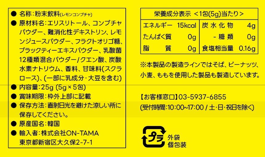 [10個]ON-TAMA TEAZEN レモンコンブチャ 5g×5包 | TEAZENコンブチャの代表的なフレーバー。サッパリとした甘酸っぱいレモン味。