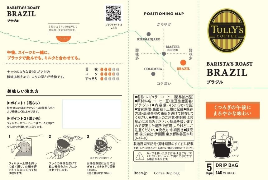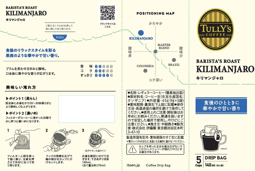 - TULLY’S COFFEE BARISTA’S ROAST ブラジル 45g(9g×5袋) / キリマンジャロ 45g(9g×5袋)