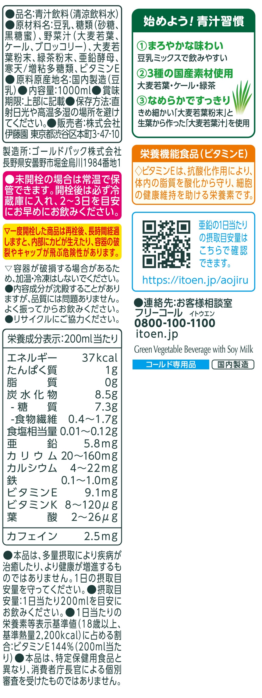 - 豆乳でおいしい 毎日1杯の青汁 すっきりまろやか 紙パック 屋根型キャップ付容器 1000ml