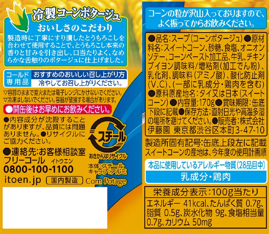 [90本]伊藤園 冷製コーンポタージュ 広口缶 170g | 食欲が減退する暑い時期でも軽食代替に好適な冷やしておいしいコーンポタージュ