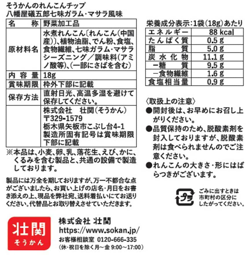 [48個]壮関 そうかんのれんこんチップ 八幡屋礒五郎七味ガラム・マサラ風味 18g | エスニックな味わいのパリッとれんこんチップ