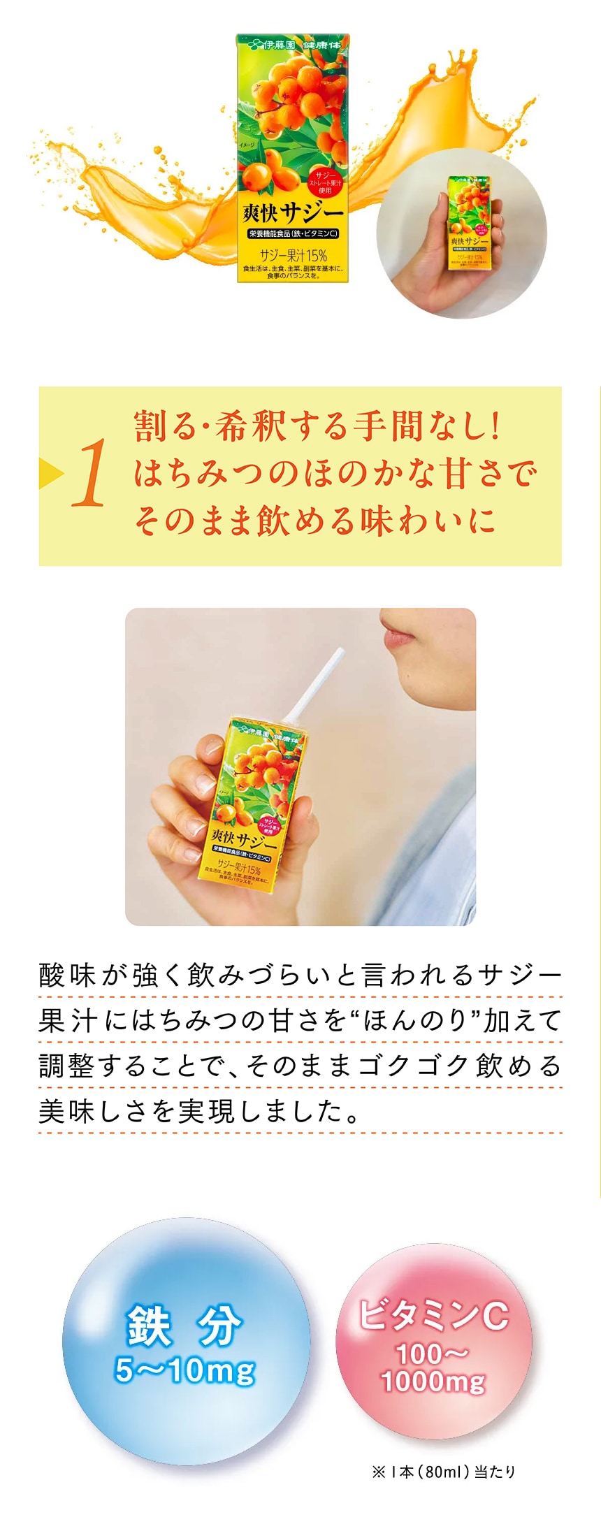 ・割る・希釈する必要なし!はちみつの自然な甘さでそのまま飲める味わいに。酸味が強く飲みづらいと言われるサジー果汁にはちみつの甘さを“ほんのり”加えて調整することで、そのままごくごく飲める美味しさを実現しました。