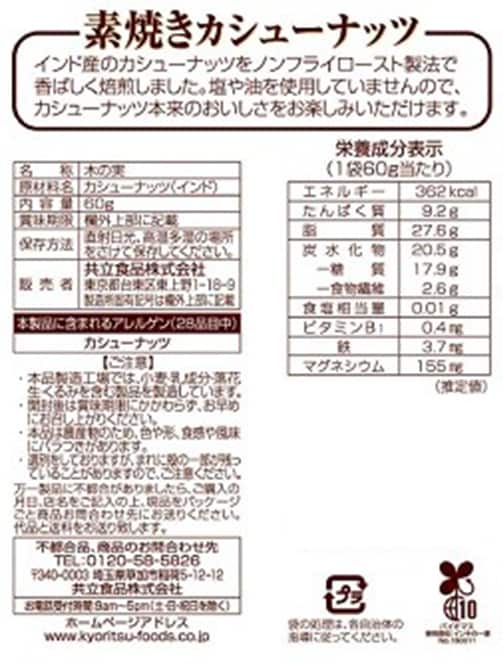 [20袋]共立食品 素焼きカシューナッツ チャック付 60g
