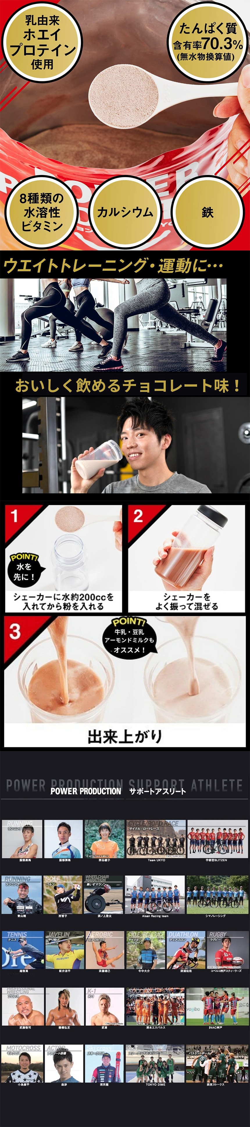 乳清たんぱく(アメリカ製造)、ココアパウダー、デキストリン、食塩、中鎖脂肪酸トリグリセリド/グリシン、炭酸Ca、V.C、香料、甘味料(ソーマチン、アスパルテーム・L-フェニルアラニン化合物、スクラロース、アセスルファムK)、ナイアシン、パントテン酸Ca、ピロリン酸鉄、V.B1、V.B2、加工デンプン、V.B6、葉酸、V.B12、(一部に乳成分を含む)