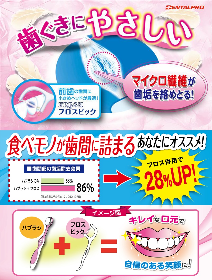 [6個]デンタルプロ FRESH フレッシュフロスピック 100本入 | きめの細かいふんわり繊維で歯肉を傷つけにくく、やさしく歯垢を除去できます。