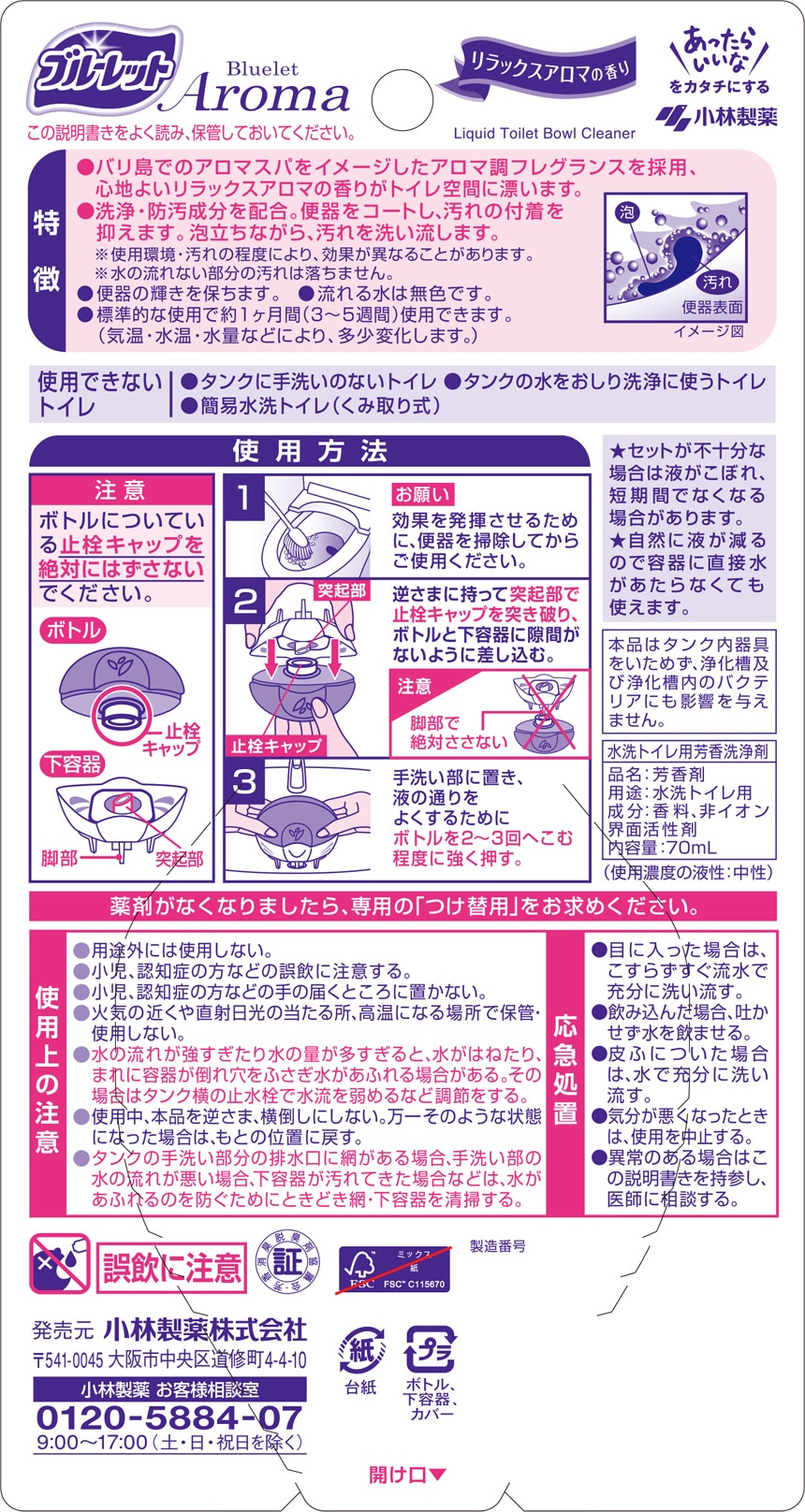 [11個]小林製薬 液体ブルーレットおくだけアロマ リラックスアロマの香り 70ml | 洗浄・防汚成分を配合。流すたびに便器表面をコートし、汚れの付着を抑える。