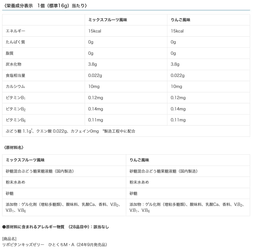 ●リポビタンキッズゼリー ひとくちタイプ ミックスフルーツ風味(無果汁)&りんご風味(無果汁)は、成長期のお子さまに必要なカルシウム、ビタミンB1・B2・B6、ぶどう糖を配合したゼリーです。