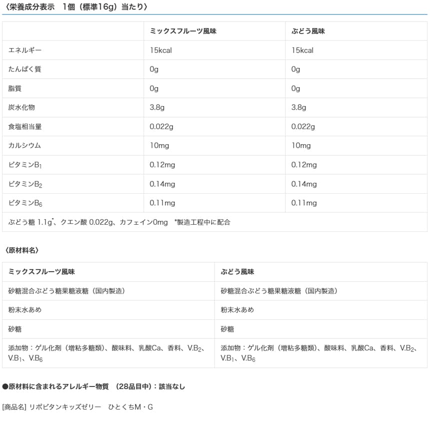 ●リポビタンキッズゼリー ひとくちタイプ ミックスフルーツ風味(無果汁)&ぶどう風味(無果汁)は、成長期のお子さまに必要なカルシウム、ビタミンB1・B2・B6、ぶどう糖を配合したゼリーです。