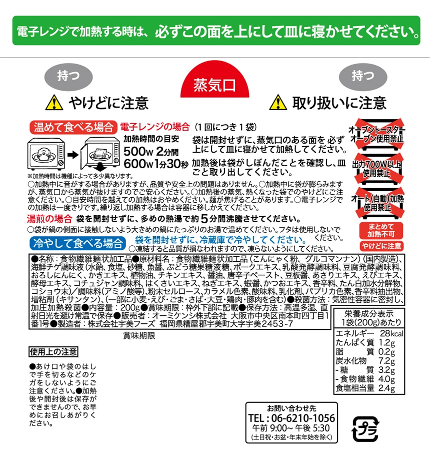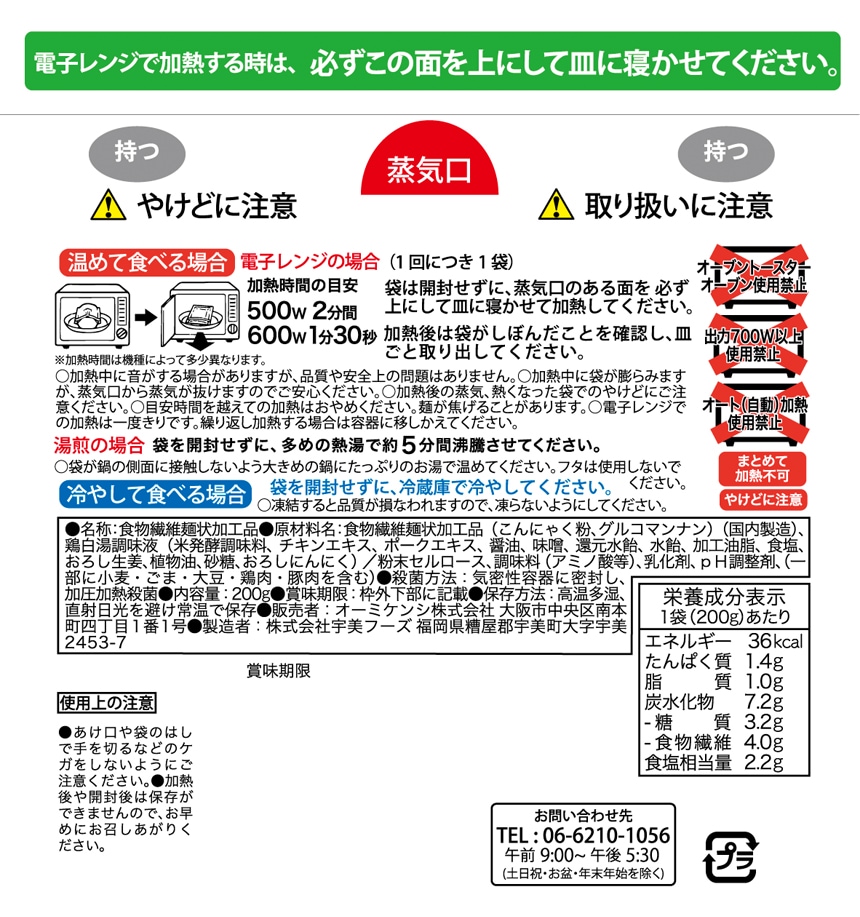 1袋200gあたり糖質1.0g、14kcal、食物繊維4,400mg含まれています。まろやかな鯛だし味で、温めるとにゅうめん風においしくお召し上がりいただけます。