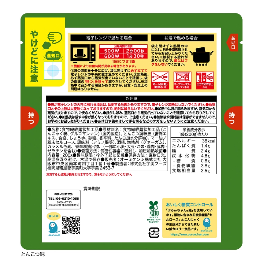 1袋200gあたり糖質0.8g、38kcal、食物繊維3,800mg含まれています。とんこつスープにコクのあるマー油のアクセントでまるで熊本とんこつラーメン風。麺はこんにゃくと食物繊維ベースで、クセがなく春雨のような食感。