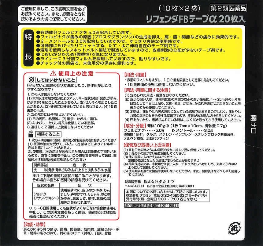 [計80枚]【第2類医薬品】タカミツ リフェンダFBテープα 20枚入 | 肩・腰・関節の痛みにフェルビナクが効く!