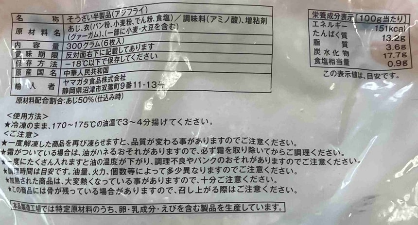 [10袋]ヤマガタ食品 ふっくらアジフライ 300g(6枚入)