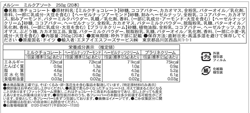 [10箱]メルシー ミルクアソート 250g(20本) | 選りすぐりのミルクチョコレート4種が5本ずつ入っています。