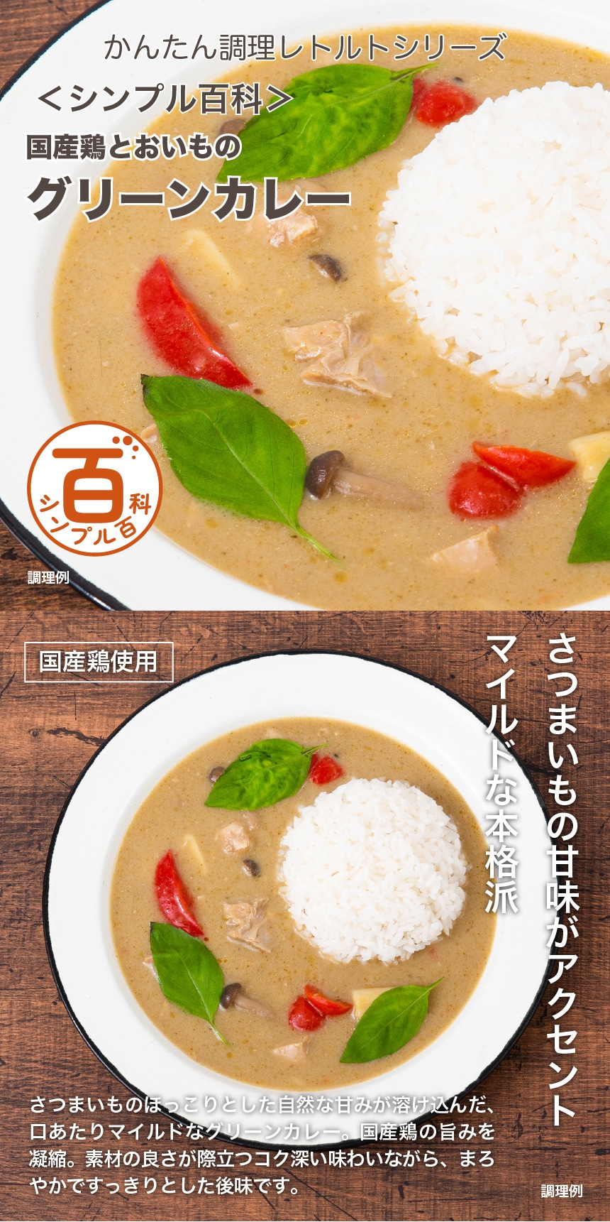 [計5食]<シンプル百科>国産鶏とおいものグリーンカレー 180g×5食×1個 | さつまいもの甘味がアクセントのマイルドなグリーンカレー。