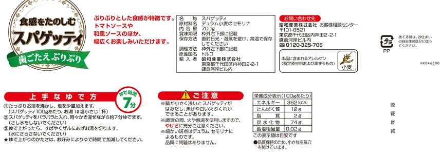 デュラム小麦のセモリナを100%使用したスパゲッティです。1.6mmは、ぷりぷりとした食感が特長です。トマトソースや和風ソースのほか、幅広くお楽しみいただけます。