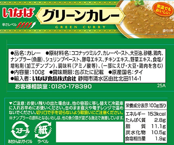 グリーンカレーの缶詰です。常温のままでもご飯やパンなどとおいしく召し上がることができます。また、具が溶け込んでいるため、お料理の調味料としてもお使いいただけます。