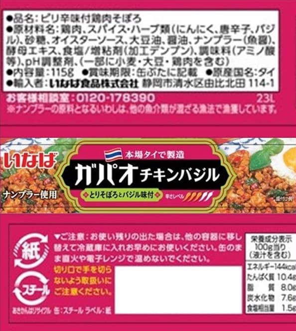 - ・ガパオチキンバジル ラベル缶 115g×24個