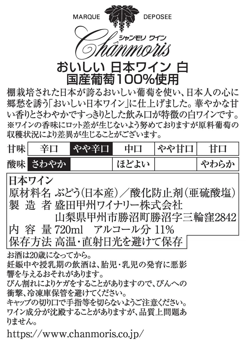 【シャンモリ おいしい日本ワイン100%白】