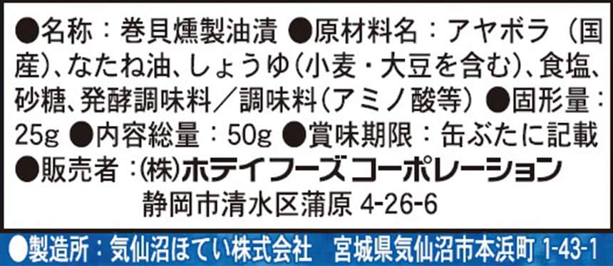 【クラフトスモーク 北海道産つぶ貝】1缶(50g)当たり エネルギー 170kcal、たんぱく質 6.9g、脂質 15.2g、炭水化物 1.4g、食塩相当量 1.1g