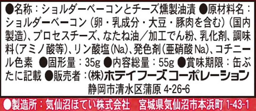 【クラフトスモーク ベーコン&チーズ】1缶(55g)当たり エネルギー 223kcal、たんぱく質 7.2g、脂質 20.5g、炭水化物 2.4g、食塩相当量 1.4g