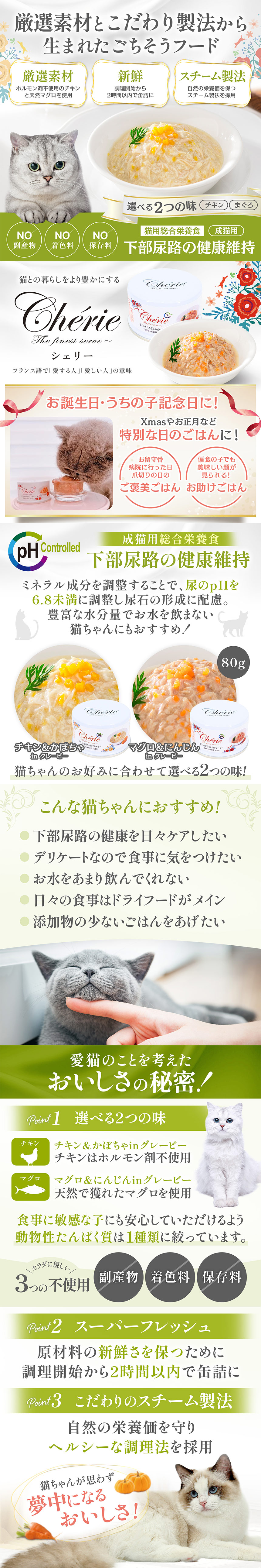 <Cherie=シェリー フランス語で「愛しい人、愛する人」>厳選した原材料とこだわりの製法で高い嗜好性を持つ成猫用総合栄養食。ミネラル成分を調整し、尿石の形成に配慮。動物性たんぱく質はホルモン剤不使用のチキンのみを使用、グルテンフリーでグルテン等にアレルギーのある子に配慮しています。自然の栄養価を保つためスチーム製法を採用。食品の鮮度を維持するために、全ての原材料は調理開始から2時間以内に製品化されます。着色料、保存料不使用。