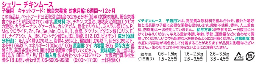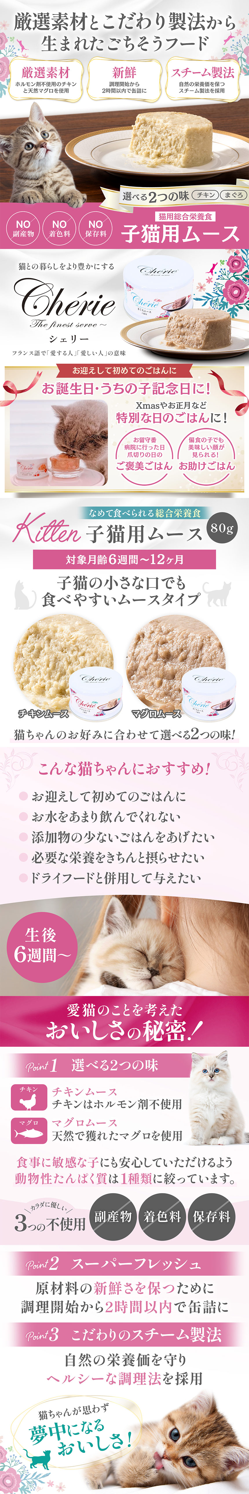 <Cherie=シェリー フランス語で「愛しい人、愛する人」>厳選した原材料とこだわりの製法で高い嗜好性を持つ子猫用総合栄養食ムース。成長期の子猫に必要な栄養を提供します。動物性たんぱく質はホルモン剤不使用のチキンのみを使用、グルテンフリーでグルテン等にアレルギーのある子に配慮しています。自然の栄養価を保つためスチーム製法を採用。食品の鮮度を維持するために、全ての原材料は調理開始から2時間以内に製品化されます。香料、着色料、保存料不使用。