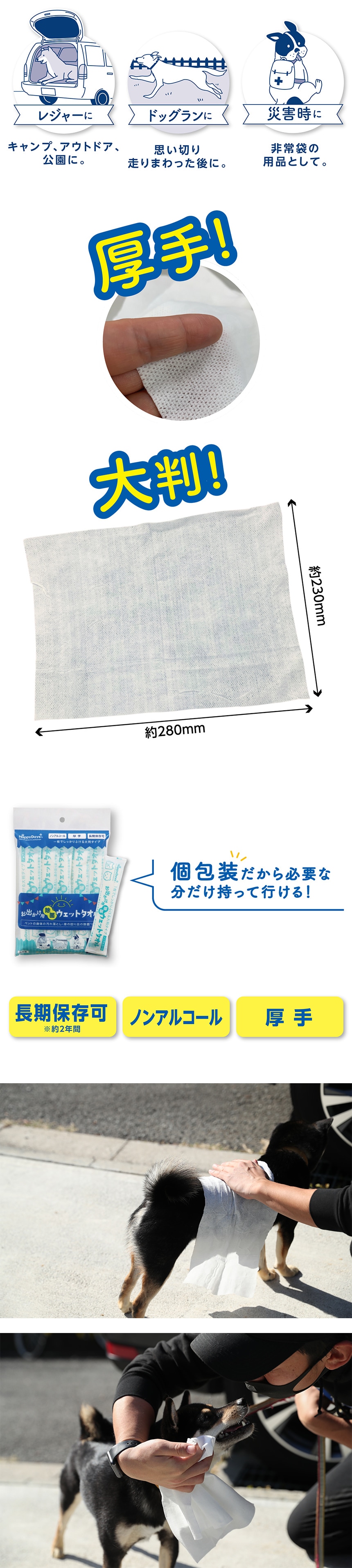 お出かけに便利な個包装の厚型大判ウェットタオル。丈夫な不織布素材で破れにくく、一枚でしっかりふけます。ペットの身体の汚れ落としや、身の回り品の除菌に使えます。アウトドア、レジャー、ドッグラン、キャンプなど、様々なシチュエーションで使えます。ペットにやさしいノンアルコールタイプ。長期保存しても乾かないので、防災用品としてもおすすめ(2年間)。