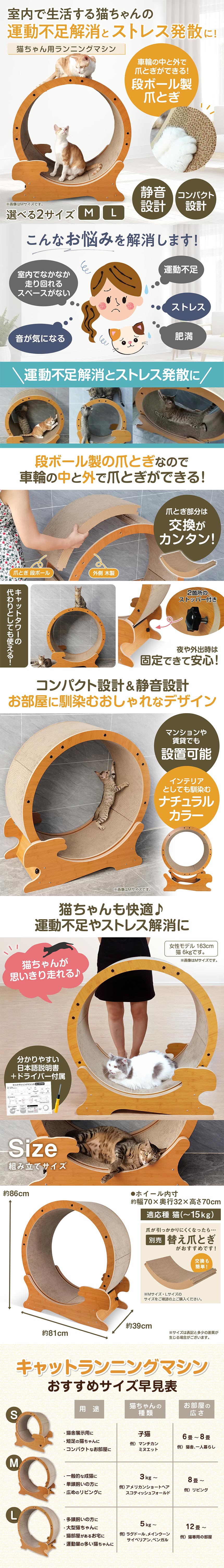 猫ちゃん用のランニングマシン。室内で生活する猫ちゃんの運動不足解消とストレス発散におすすめ。車輪の本体は段ボール製の爪とぎなので、車輪の中と外で爪とぎができます(別売りで替え爪とぎあり)。夜や外出時など必要な時は回らないように固定できるので、キャットタワーがわりにも使えます。幅約81cm、奥行約39cmとサークルサイズのコンパクト設計でスペースが少ないお家やマンションでも設置可能。回る音が静かなので、集合住宅でも使えます。