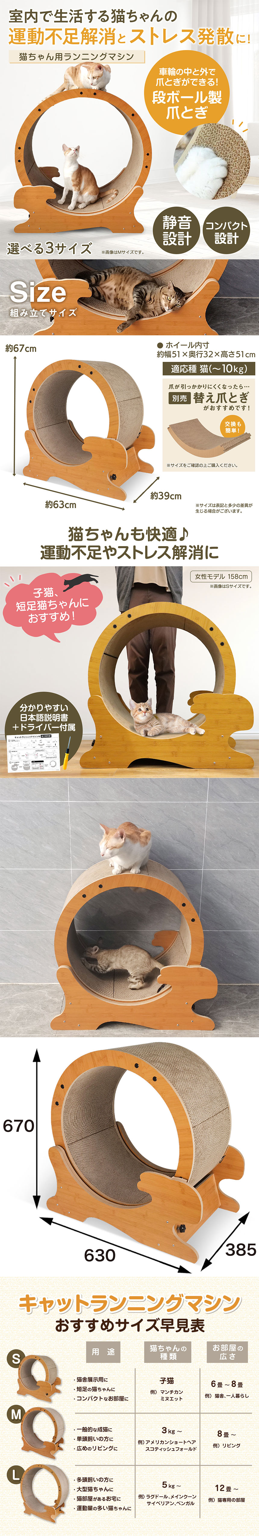 猫ちゃん用のランニングマシン。室内で生活する猫ちゃんの運動不足解消とストレス発散におすすめ。車輪の本体は段ボール製の爪とぎなので、車輪の中と外で爪とぎができます(別売りで替え爪とぎあり)。夜や外出時など必要な時は回らないように固定できるので、キャットタワーがわりにも使えます。コンパクトサイズなので一人暮らしのお部屋にもおすすめ。回る音が静かなので、集合住宅でも使えます。