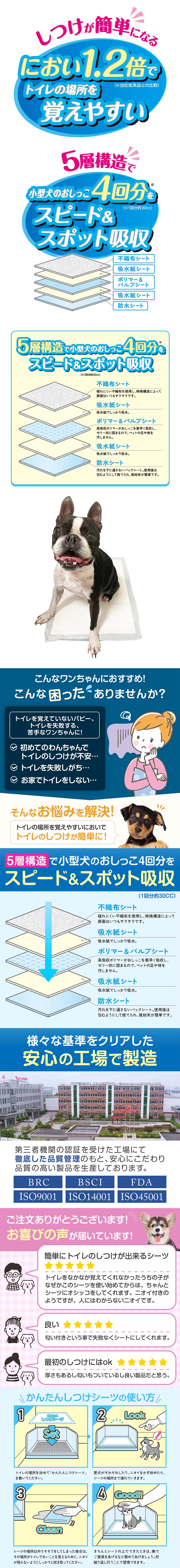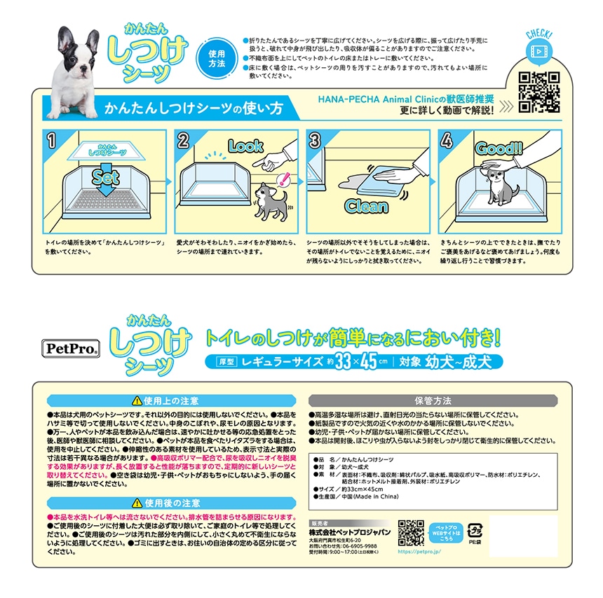 パピーのトイレトレーニングをサポートするシーツです。5層構造(不織布シート・吸水紙シート・ポリマー&パルプシート・吸水紙シート・防水シート)で小型犬のおしっこ4回分(1回約30cc)をスピード&スポット吸収。パッケージのQRコードから獣医師推奨のトイレトレーニング動画が見ることができます。幼犬だけでなく、成犬にもご使用いただけます。