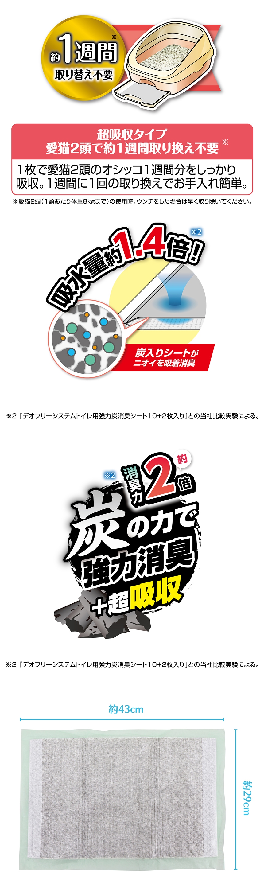 炭入りシートがニオイ成分を吸着し、強力に消臭する複数ねこ用システムトイレシートです。1枚で愛猫2頭のオシッコ約1週間分をしっかり吸収*。1週間に1回の取り替えでお手入れが簡単にできます。*愛猫2頭(1頭あたり体重8kgまで)の使用時。ウンチをした場合は早く取り除いてください。尿量の多い愛猫にもおすすめです。