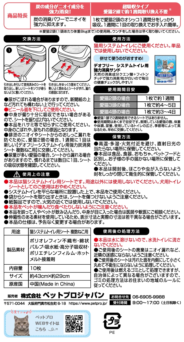 [4個]ペットプロジャパン デオフリー 強力炭消臭シート 複数ねこ用 10枚入 | 炭の力で強力消臭+超吸収!複数ねこ用システムトイレシート