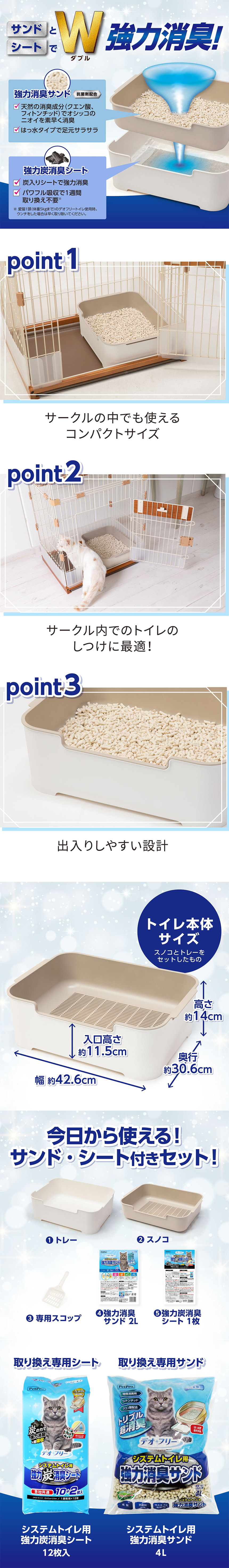 トレー、スノコ、専用スコップ、強力消臭サンド2L(約1か月分)、強力炭消臭シート(約1週間分)