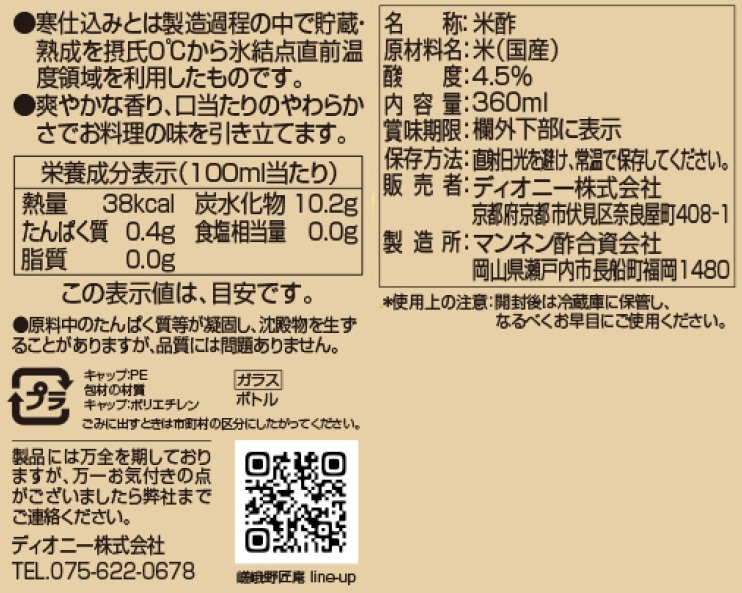 [12本]ディオニー 嵯峨野匠庵 純米酢 360ml | 国内産の米を使用し、昔ながらの製法で醸造しました。
