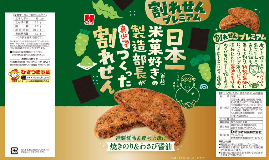 [36個]ひざつき製菓 割れせんプレミアム 焼きのり&わさび醤油 35g | 日本一米菓好き(自称)の製造部長が真心こめてつくった割れせん
