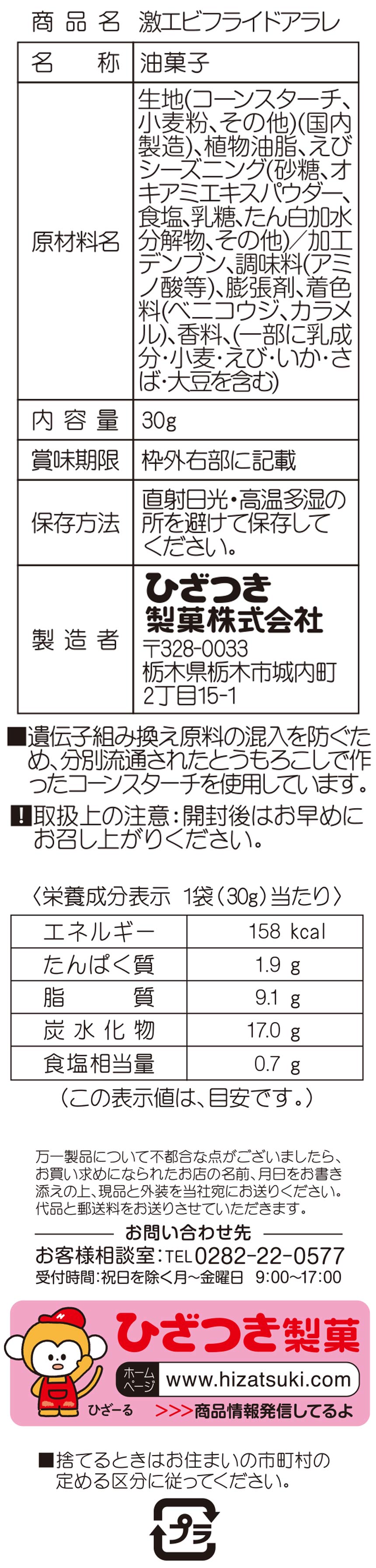 [36個]ひざつき製菓 ひざつき 激エビフライドアラレ 30g | 生地に海老とするめ粉を練り込み、さくっと揚げた後にさらに海老パウダーをうわがけしました。
