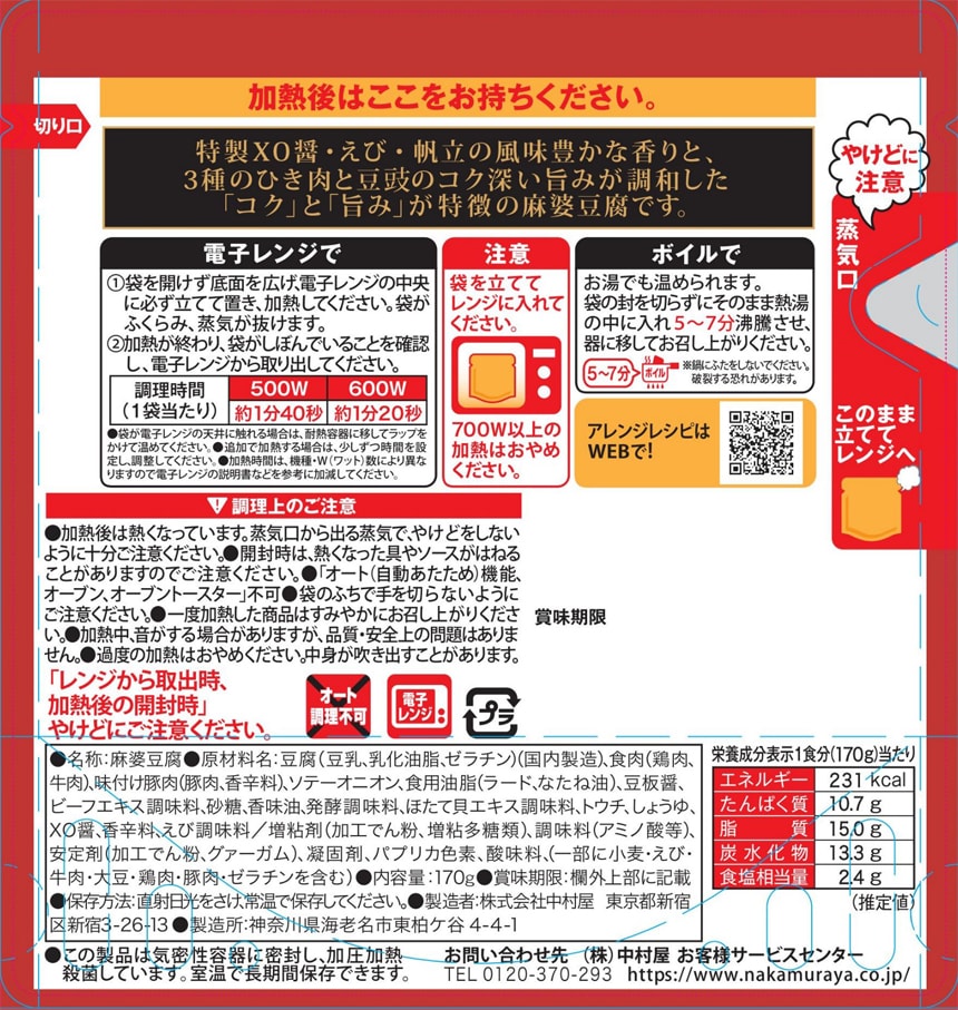 [24個]中村屋 新宿中村屋 本格四川 コクと旨み、ひろがる麻婆豆腐(豆腐入り) 170g | 3種のひき肉と豆鼓の「コク」と「旨み」が特徴のレンジ調理の本格麻婆豆腐です。